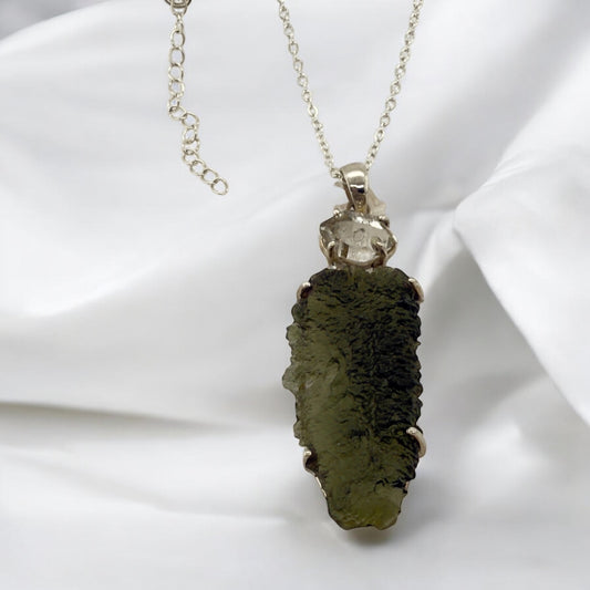 Moldavite with Herkimer Diamod pendant 925 Sterling Silver